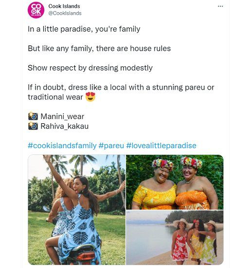 이와 관련해 쿡제도 공식 트위터 계정은 "작은 천국에서 당신은 가족"이라며 "그러나 다른 가족과 마찬가지로 집안에서 지켜야 할 규칙이 있다. 적절하게 옷을 입어 존중해달라"고 주문했다.