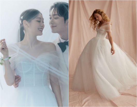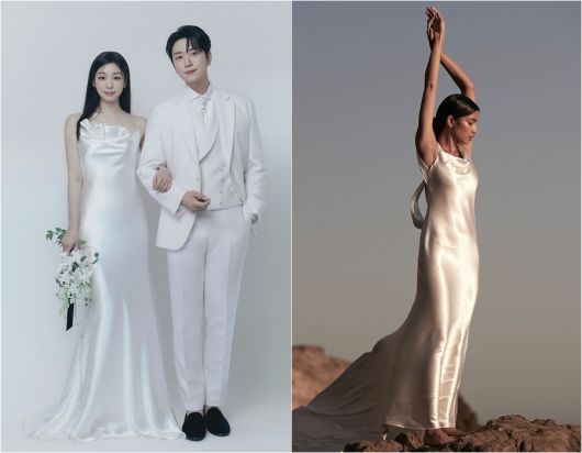 웨딩사진 속 드레스도 화제다. 고운 베일 속에서 고우림과 환하게 웃고 있는 사진 속 드레스는 오스카 드 라 렌타(Oscar de la Renta)의 제품. 2022년 가을 콜렉션 젝품으로 우아한 샤 디테일로 눈길을 모은다.