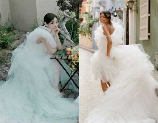 22일 결혼식에서 입은 김연아의 드레스는 엘리 사브(Elie Saab) 봄 2023 컬렉션 제품이다. 꽃잎을 겹겹이 붙인 듯한 디테일과 풍성한 베일이 시선을 붙드는 제품이다. 김연아는 실플하지만 화려하게 반짝이는 티아라를 더해 더욱 아름답게 드레스를 소화했다.