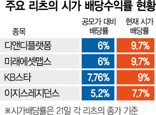 이와함께 지난달 상장한 KB스타리츠(432320)와 이지스 레지던스 리츠 등도 각각 9%, 7.7%의 높은 시가 배당수익률을 기록 중이다. 지난해 코스피 상장사의 배당수익률(2.32%)과 비교하면 4배 가량 높은 셈이다. 장문준 KB증권 연구원은 "불안한 거시 경제 환경과 금리 상승으로 리츠주가 자산 가치 대비 과매도가 이어지고 있다" 면서 "자금 조달의 안정성을 볼 때 배당 가능 이익이 금리 때문에 감소할 가능성은 당분간 낮다"고 설명했다.