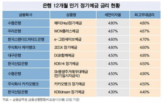 23일 금융권에 따르면 지난 21일 기준 은행 1년 만기 정기예금 가운데 기본 금리가 가장 높은 상품은 수협은행의 ‘헤이(Hey)정기예금’으로, 연 4.80%의 이자를 준다. 우리은행 ‘원(WON)플러스예금’의 금리는 연 4.66%다. 케이뱅크 ‘코드K정기예금’과 SC제일은행 ‘e-그린세이브예금’은 연 4.60%의 금리를 제공한다.