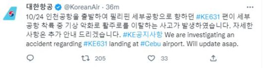 대한항공 여객기가 필리핀 세부 막탄공항에서 23일(현지시간) 오후 11시께 활주로를 이탈(오버런·overrun)하는 사고가 발생했다.
