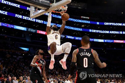 24일 포틀랜드 전에서 덩크슛하는 LA 레이커스 제임스 |