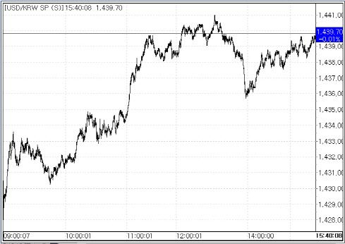 24일 서울외국환중개에 따르면 환율은 전 거래일 종가(1439.8원)보다 0.1원 하락한 1439.7원에 마감했다. 이날 환율은 전일 대비 9.8원 내린 1430.0원에 시작한 뒤 오전 중 1429.0원까지 떨어지기도 했지만 다시 낙폭을 점차 줄여갔다. 환율은 1440.9원까지 상승 반전하기도 했지만, 장 마감 이전 다시 하락하면서 약보합권에서 등락하다 마감했다.