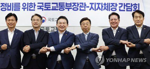 1기 신도시 지자체장들과 손잡은 원희룡 국토부 장관 |