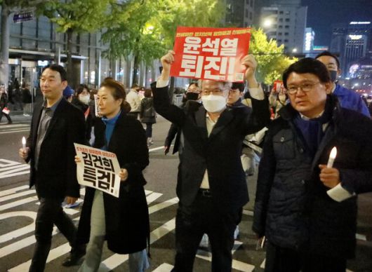 최근까지만 해도 김 의원의 이런 주장은 개인의 ‘돌출’ 발언으로 비쳐졌다. 하지만 검찰이 이재명 대표를 비롯한 민주당 인사들을 겨냥한 검찰 수사가 가속화하면서, 지난 22일 서울 도심에서 열린 ‘김건희 특검·윤석열 퇴진 촛불집회’에 안민석·황운하·양이원영 의원 등이 함께 참석하는 등 최근 민주당 안에서도 윤 대통령의 퇴진 가능성에 무게를 싣는 강경파 의원들이 조금씩 늘고 있다.