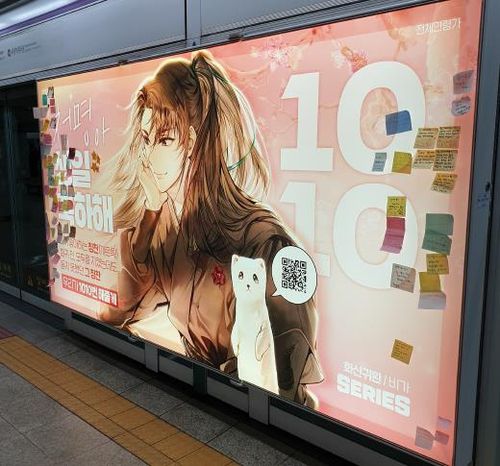 25일 웹툰 업계에 따르면 네이버시리즈는 이달 초 대표 노블코믹스(웹툰화한 웹소설) '화산귀환' 속 주인공 청명의 생일(10월 10일)을 축하하기 위해 5호선 청구역과 4호선 명동역, 신분당선 판교역 세 군데에 대형 생일 광고를 내걸었다.