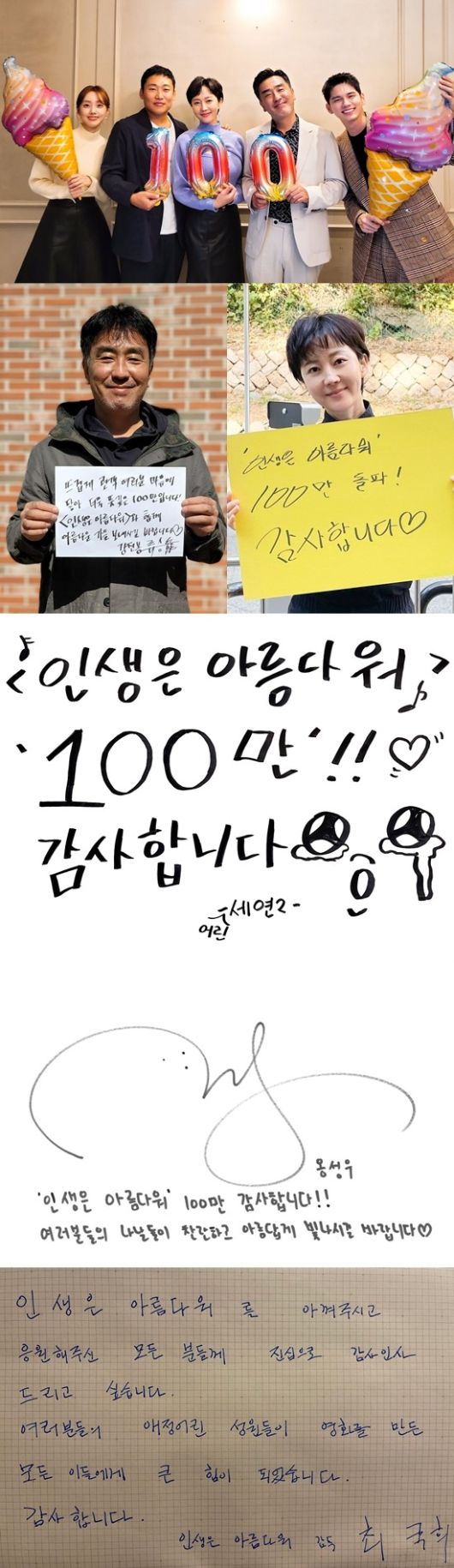 여기에 “'인생은 아름다워'를 아껴주시고 응원해 주신 모든 분들께 진심으로 감사 인사드리고 싶습니다. 여러분들의 애정 어린 성원들이 영화를 만든 모든 이들에게 큰 힘이 되었습니다. 감사합니다”(감독 최국희), “뜨겁게 관객 여러분 마음에 닿아 더욱 뜻깊은 100만입니다! '인생은 아름다워'와 함께 아름다운 가을 보내시킬 바랍니다”(배우 류승룡), “'인생은 아름다워' 100만 돌파! 감사합니다”(배우 염정아), “'인생은 아름다워' ‘100만’!! 감사합니다”(배우 박세완), “'인생은 아름다워' 100만 감사합니다!! 여러분들의 나날들이 찬란하고 아름답게 빛나시길 바랍니다”(배우 옹성우)라는 감독과 배우들의 친필 메시지가 공개돼 이목을 집중시킨다.