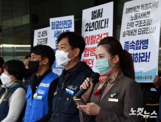 28일 김포공항 국내선 청사 앞에서 열린 ‘2022년 항공의 날, 항공산업 코로나19 일터회복 및 밀실합병 중단 촉구 기자회견’ 에 참석한 아시아나항공노조 박시은 부위원장이 발언을 하고 있다.저작권자 © CBS 노컷뉴스 무단전재 및 재배포 금지