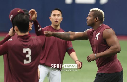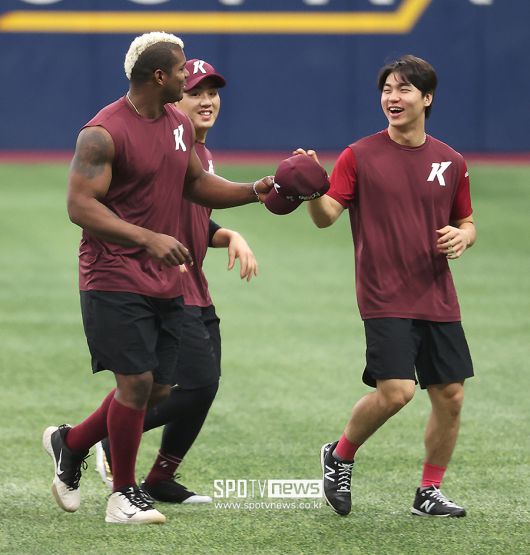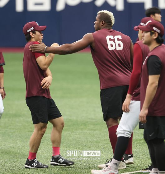 [스포티비뉴스=고척, 곽혜미 기자] 키움 푸이그가 '절친' 신준우와 티격태격 장난을 치며 훈련을 했다.