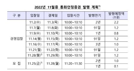 10월 발행과 비교하면 1·2·3년물이 5000억원 증가했지만, 91일물이 5000억원 줄면서 같은 규모로 발행될 예정이다. 이 중 경쟁입찰로 8조8000억원을, 모집을 통해 1조1000억원을 발행한다.