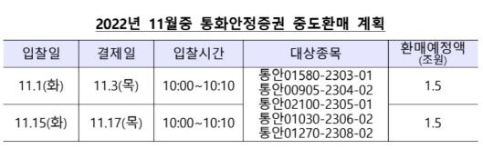 11월중 중도환매 규모는 3조원 가량이다. 입찰일은 11월 1일, 15일 이틀로 각각 1조5000억원 가량씩 환매예정액이 정해졌다.