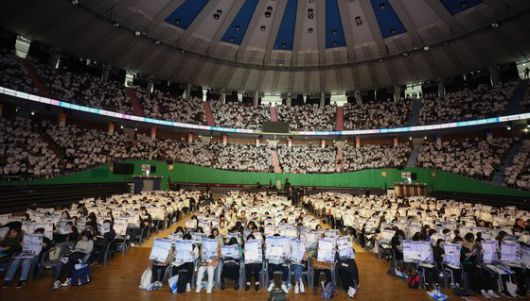 지난 2019년 메가스터디 주최로 열린 입시설명회에서 수험생과 학부모들이 정시 지원 배치 참고표를 살펴보고 있다. 뉴스1 |