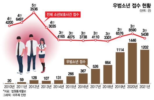 29일 법원통계월보에 따르면 우범소년 접수건수는 가파르게 증가하는 추세다. 2010년 연간 20건에 그쳤던 우범소년 접수건수는 2014년까지 연간 100여건에 머물렀다. 하지만 이후 폭발적으로 증가하면서 2018년 664건, 2019년 1114건까지 치솟았다. 2020년에는 1446건으로 정점을 찍었고 지난해에는 1202건으로 소폭 줄어든 상황이다.