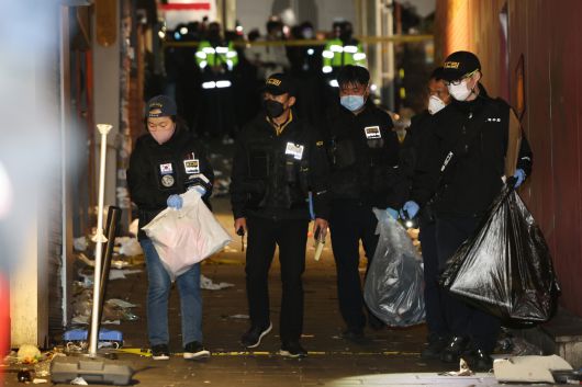 30일 새벽 경찰 과학수사대원 등이 인명사고가 발생한 서울 용산구 이태원 현장을 살펴보고 있다. [연합] |