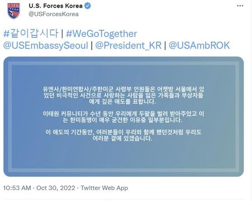 주한미군은 이날 "유엔사·한미연합사·주한미군사령부 인원들은 어젯밤 서울에서 있었던 비극적인 사건으로 사랑하는 사람을 잃은 가족들과 부상자들에게 깊은 애도를 표합니다"라고 소셜미디어 등 온라인을 통해 밝혔다.