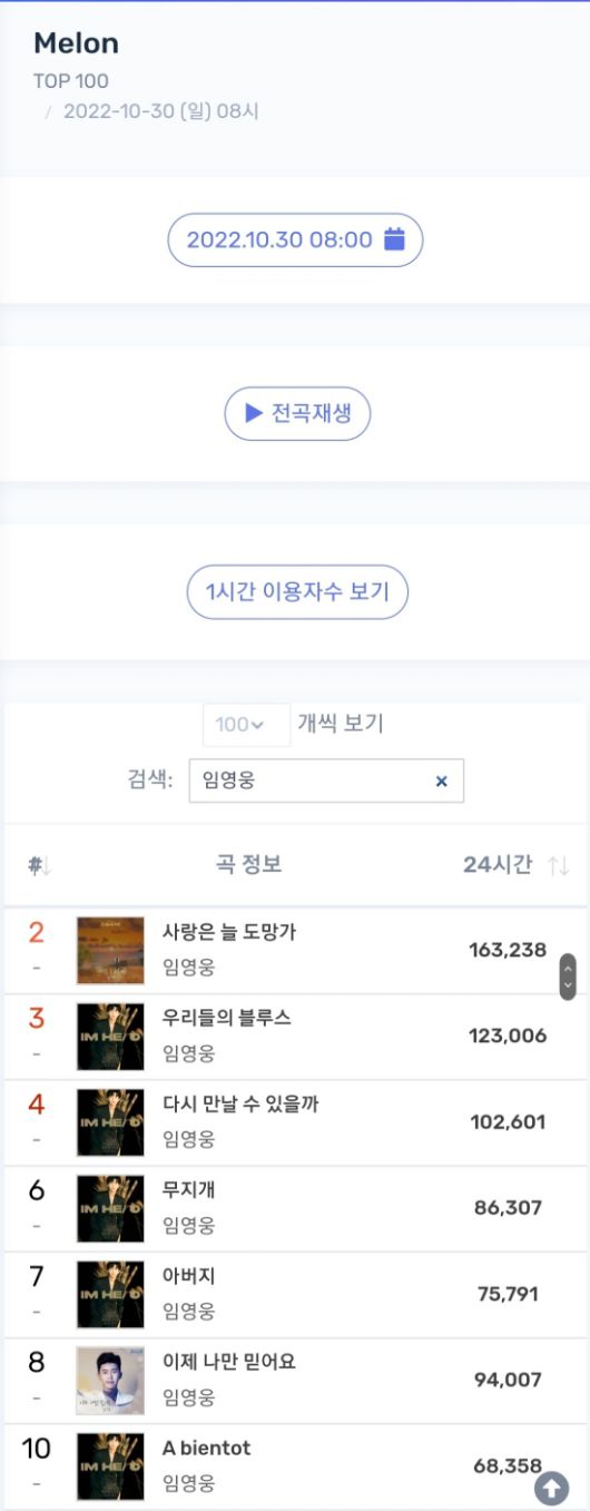 2위 ‘사랑은 늘 도망가’, 3위 ‘우리들의 블루스’, 5위 ‘다시 만날 수 있을까’, 6위 ‘무지개’, 7위 ‘아버지’ 8위 ‘이제 나만 믿어요’, 10위 ‘A bientot’ 등이 멜론차트 상위권을 차지한 것.