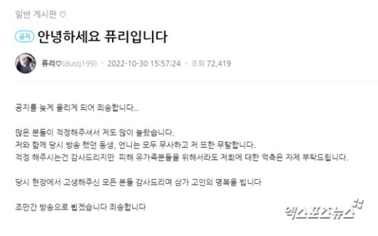 (엑스포츠뉴스 황수연 기자) 이태원 압사 사고 현장에 있었던 아프리카 BJ 퓨리가 무사하다는 근황을 밝혔다.