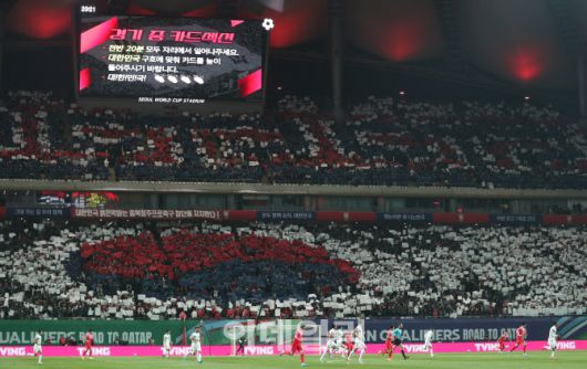 대한민국과 이란의 2022년 카타르 월드컵 아시아 최종예선 9차전이 3월 24일 오후 서울 마포구 상암 월드컵경기장에서 열렸다. 만원관중이 카드섹션으로 대한민국을 응원하고 있다.(사진=이데일리 노진환 기자) |
