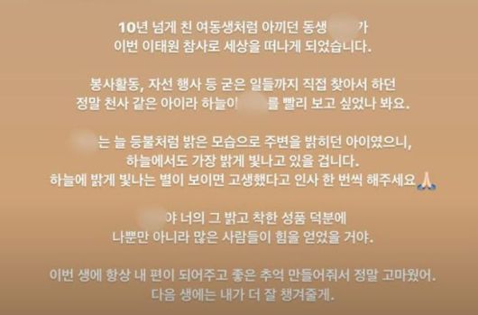 정재호는 1일 개인 SNS에 “10년 넘게 친여동생처럼 아끼던 ㅇㅇ가 이번 이태원 참사로 세상을 떠나게 됐습니다. 봉사활동, 자선행사 등 궂은 일까지 직접 찾아서 하던 정말 천사같은 아이라 하늘이 빨리 보고싶었나 봐요”라고 소식을 알렸다.