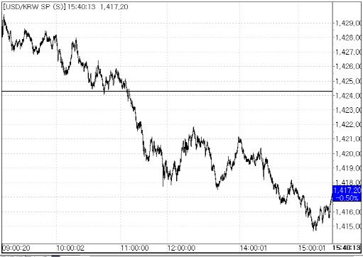 1일 서울외국환중개에 따르면 환율은 전 거래일 종가(1424.3원)대비 7.1원 내린 1417.2원에 마감했다. 이날 환율은 전일 대비 4.2원 오른 1428.5원에 시작해 4원 안팎의 상승폭을 보이다가 오전 11시 이후 하락 전환했다. 환율이 1410원대로 하락한 것은 3거래일 만이다.