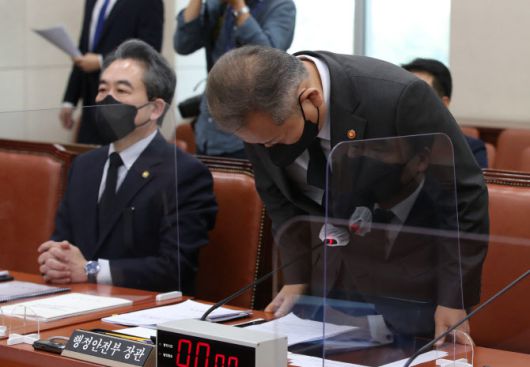 이상민 행정안전부 장관이 1일 서울 여의도 국회에서 열린 행정안전위원회 전체회의 ‘이태원 사고 관련 현안보고’에서 허리숙여 사과하고 있다.(사진=노진환 기자) |