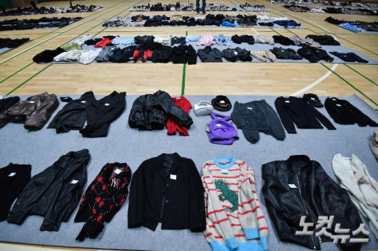 이태원 핼러윈 압사 참사 나흘째인 1일 서울 용산구 원효로 다목적 체육관에 마련된 '이태원 참사 유실물센터'. 주인 잃은 수백점의 옷가지와 짓밟혀 흙자국이 선명한 신발, 그리고 흰 티셔츠은 피로 물들어 사고 당시의 참혹함을 드러냈다.