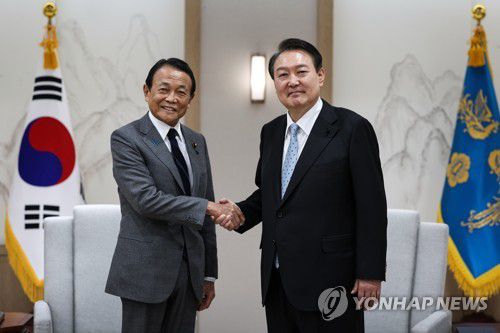 교도통신은 또 "아소 전 총리와 윤 대통령은 탄도미사일 발사를 반복하는 북한 대응에 대한 의견도 교환했으며 아소 전 총리가 다수의 사망자가 발생한 이태원 사고에 대해 조의도 전했을 것으로 보인다"고 덧붙였다.