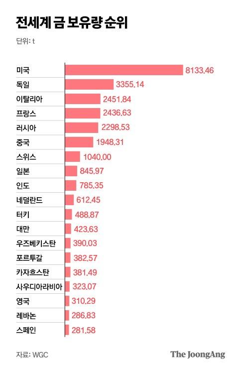 ‘러시아 학습효과’도 신흥국과 개발도상국 중앙은행이 금을 사들이는 이유로 풀이된다. 지난 2월 러시아가 우크라이나를 침공한 뒤 미국·유럽이 러시아를 상대로 각종 경제 제재에 나섰지만, 외화 곳간을 금으로 두둑하게 채운 덕에 충격을 줄일 수 있었다. WCG에 따르면 올해 9월 기준 러시아는 2298.5t의 금을 보유하고 있다. 미국, 독일에 이어 세계 5위다. 특히 이들 금이 모두 러시아 영토 내에 있어 미국·유럽의 경제 제재를 피했다.