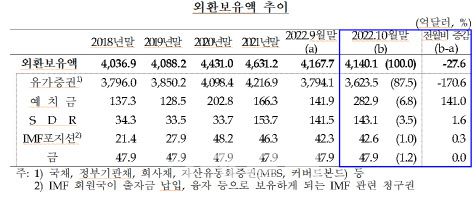 한국은행이 2일 발표한 ‘2022년 10월말 외환보유액’ 자료에 따르면 지난달 외환보유액은 한 달 동안 27억6000만달러 감소한 4140억1000만달러로 집계됐다. 외환보유액은 3월 이후 4개월째 감소하다가 7월 반등했으나 8월과 9월에 이어 10월까지 석 달 연속 빠졌다. 다만 감소폭 자체는 글로벌 금융위기 때인 2008년 10월(-274억2000만달러) 이후 역대 두 번째 감소폭을 기록했던 9월(-196억6000만달러)에 비해 큰 폭 줄었다.