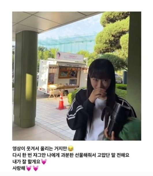 박보연은 자신에게 커피차를 선물해준 라키를 향해 "다시 한 번 조그만 나에게 과분한 선물해줘서 고맙단 말 전해요"라며 "내가 잘 할게요. 사랑해"라고 애정 듬뿍 말로 화답했다.
