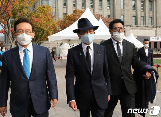 (서울=뉴스1) 송원영 기자 = 일본 자민당 부총재인 아소 다로 전 총리가 3일 오전 서울광장에 마련된 합동분향소를 찾아 조문을 마친 후 이동하고 있다. 2022.11.3/뉴스1sowon@news1.krCopyright ⓒ 뉴스1. All rights reserved. 무단 전재 및 재배포 금지.