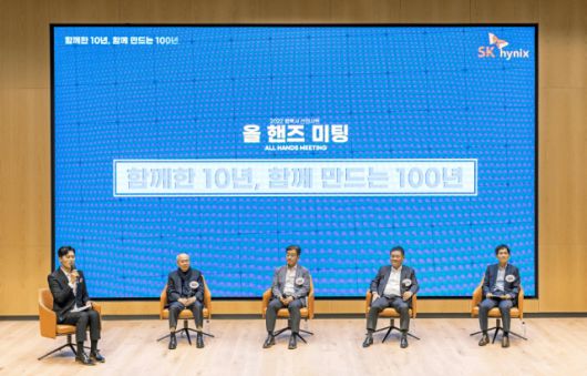 황철주(왼쪽 두번째부터) 주성엔지니어링 회장, 김성한 SK하이닉스 구매담당 부사당, 이우경 ASML코리아 대표, 김태운 SK하이닉스 상생협력 팀장 등이 직접 참여해 ‘함께한 10년, 함께 만드는 100년’을 주제로 올 핸즈 미팅도 진행됐다. 정태일 기자