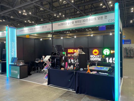 채우라가 지난 26일부터 29일까지 고양시 킨텍스에서 열린 '2022 로보월드'에 간판용 3D프린터와 교육용 3D프린터를 전시했다.