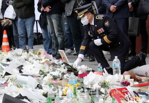 임현규 신임 용산경찰서장이 3일 오후 ‘이태원 압사 참사’ 추모공간이 마련된 서울 용산구 이태원역 1번출구에서 헌화하고 있다. (사진=뉴스1) |