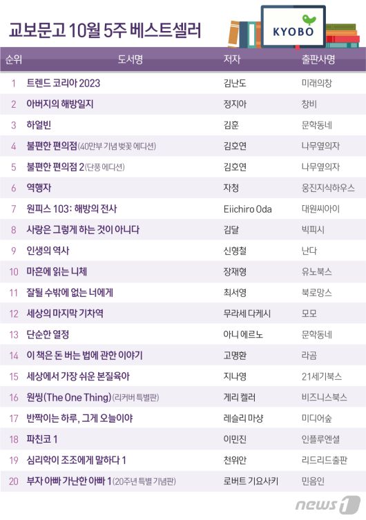 김난도 서울대 소비자학과가 쓴 '트렌드 코리아 2023'은 4주 연속 정상을 지켰다. 정지아의 '아버지의 해방일지'는 유명인의 추천 덕에 순위가 올라, 2위에 자리했다. 남성 독자는 43.8%에 달했다.