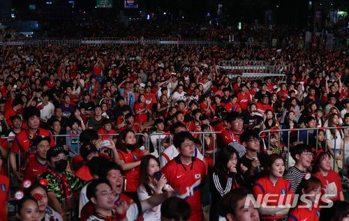 【서울=뉴시스】이영환 기자 = 2018 러시아월드컵 조별예선 F조 대한민국 대 멕시코의 경기가 열린 24일 새벽 서울 종로구 광화문 광장에서 시민들이 경기를 관람하고 있다. 2018.06.24. 20hwan@newsis.com |