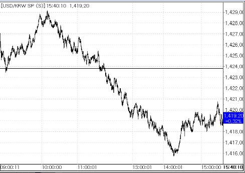 4일 서울외국환중개에 따르면 환율은 전 거래일 종가(1423.8원)대비 4.6원 하락한 1419.2원에 마감했다. 이날 환율은 전일 대비 2.2원 오른 1426.0원에 시작한 뒤 장중 1429.2원까지 올랐지만 오후들어선 1410원대로 하락 전환했다. 환율이 하락한 것은 3거래일 만이며 1410원대를 나타낸 것은 2일 이후 2거래일 만이다.