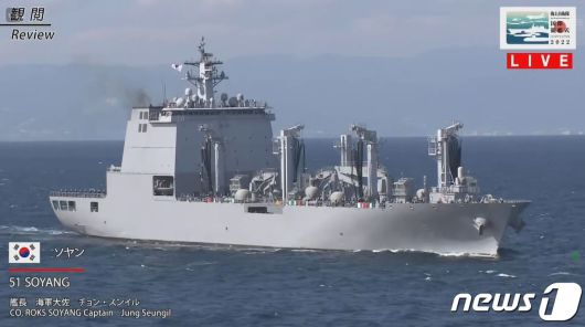 특히 우리 해군에선 1만1000톤급 군수지원함 '소양함'과 장병들이 이날 관함식 해상사열에서 참가, 기시다 후미오(岸田文雄) 일본 총리가 탑승한 다용도 운용모함(경항공모함) '이즈모'를 향해 '대함(對艦) 경례'를 했다.