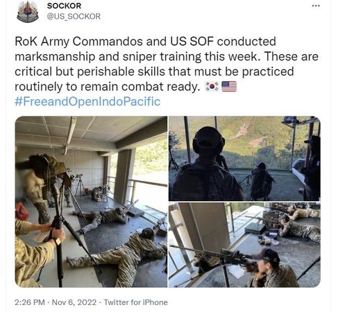 SOCKOR는 "한국 육군 특공부대와 미 특수부대가 이번 주 사격술과 저격 훈련을 했다"고 트위터 계정을 통해 밝혔다.