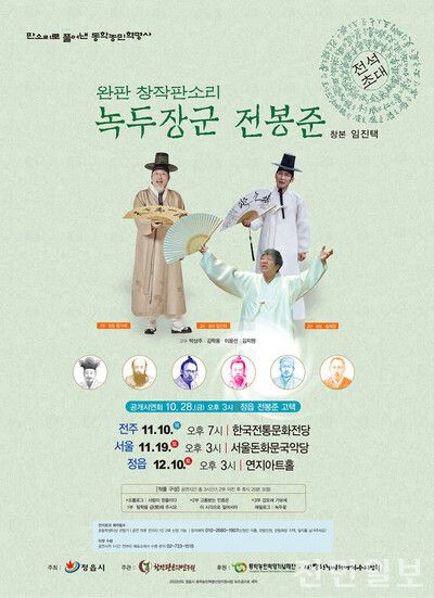 동학농민혁명사를 담은 ‘녹두장군 전봉준'이 창작 판소리로 다시 태어났다. 창작판소리연구원(원장 임진택)은 오는 10일 전주 한국전통문화전당에서 동학의 탄생 과정을 비롯해 동학농민혁명을 주도했던 전봉준의 활약상을 조명한 창작 판소리 <녹두장군 전봉준>을 공연한다.