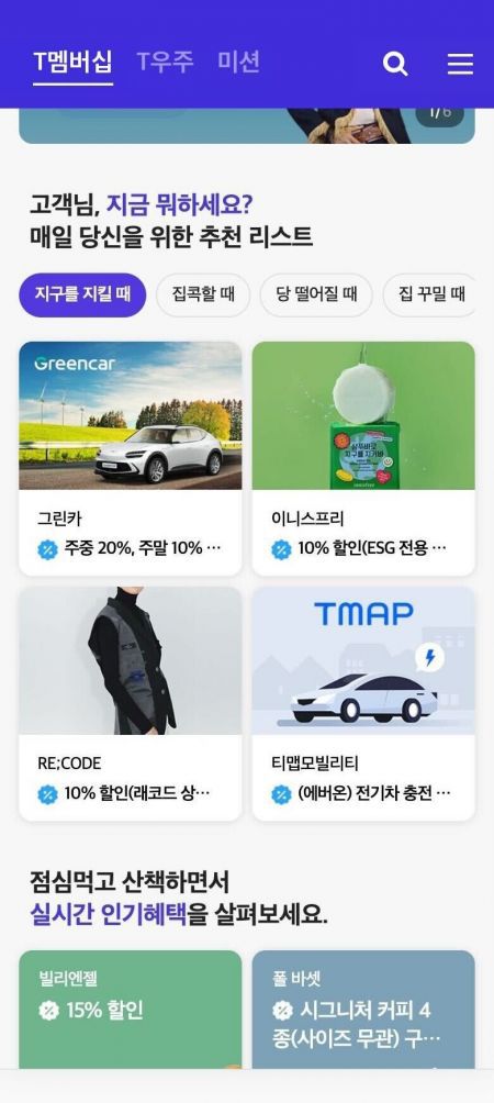 지구를 지킬 때는 ESG 확산을 위해 소비자들이 친환경 아이템 구매 시 T멤버십을 통해 추가적인 할인 또는 적립 혜택을 제공하는 서비스다.