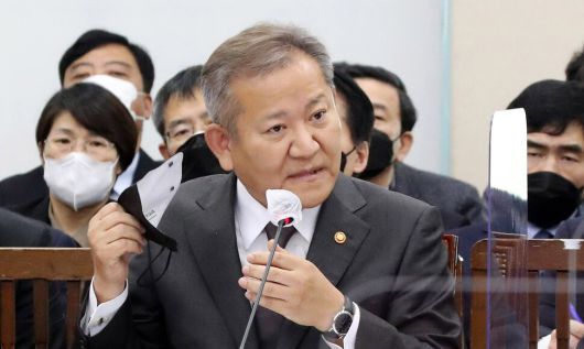 7일 오후 국회에서 열린 행정안전위원회에서 이상민 행정안전부 장관이 의원들의 질의에 답변하기 위해 마스크를 벗고 있다. 김경호 선임기자 jijae@hani.co.kr |