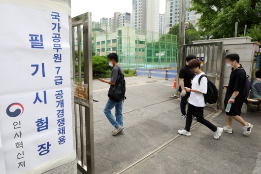 국가공무원 7급 공개경쟁채용시험 1차 시험이 치러진 7월 23일 오후 서울 강남구 역삼중학교에 마련된 시험장에 응시생들이 입실하고 있다.(뉴시스) |
