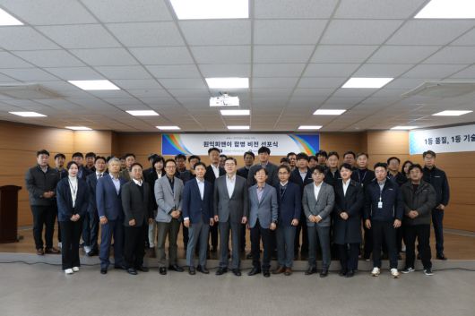 원익피앤이와 엔에스가 8일 경기 수원 본사에서 비전 선언문을 발표하고 합병 안건을 최종 승인했다. 합병 비전 선포식에 참가한 원익그룹 조남성 부회장, 원익피앤이 이기채 대표 등 임직원이 기념사진을 촬영했다. |