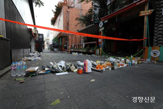 서울 용산구 이태원역 1번 출구 앞 참사 현장의 폴리스 라인 아래 추모객들이 놓고 간 물건들이 놓여있다. 한수빈 기자 |