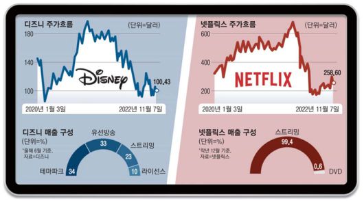 두 회사 모두 올해 주가가 크게 떨어지면서 가격 매력은 커졌지만 월가는 디즈니를 넷플릭스보다 선호하는 분위기다. 투자정보 매체 팁랭크스에 따르면 최근 3개월 기준 애널리스트들이 내놓은 디즈니의 평균 목표주가는 144.64달러로 현재 주가보다 1.4배 높은 수준이다.