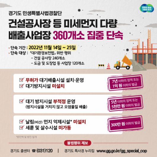 경기도 민생특별사법경찰단은 이달 14일부터 25일까지 날림(비산)먼지 다량 발생 공사장 240곳, 초미세먼지 2차 생성에 영향을 미치는 휘발성유기화합물 다량 배출 도금 및 도장업 등 대기 배출시설 120곳 등 총 360곳을 대상으로 불법행위를 집중 단속을 벌인다고 9일 밝혔다.