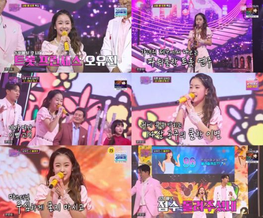 이날 오유진은 김지애의 ‘물레야’를 선곡했다. 오유진은 탄탄하고 힘 있는 목소리로 첫 소절부터 듣는 이들을 사로잡았고 96점을 받아 홍지윤에게 승리를 거뒀다.