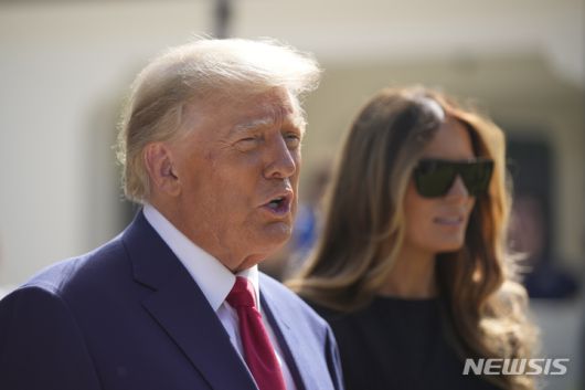 [팜비치=AP/뉴시스]도널드 트럼프 미국 대통령이 8일(현지시간) 플로리다 팜비치 소재 투표소에서 투표를 마친 후 취재진과 대화하고 있다. 2022.11.08. |